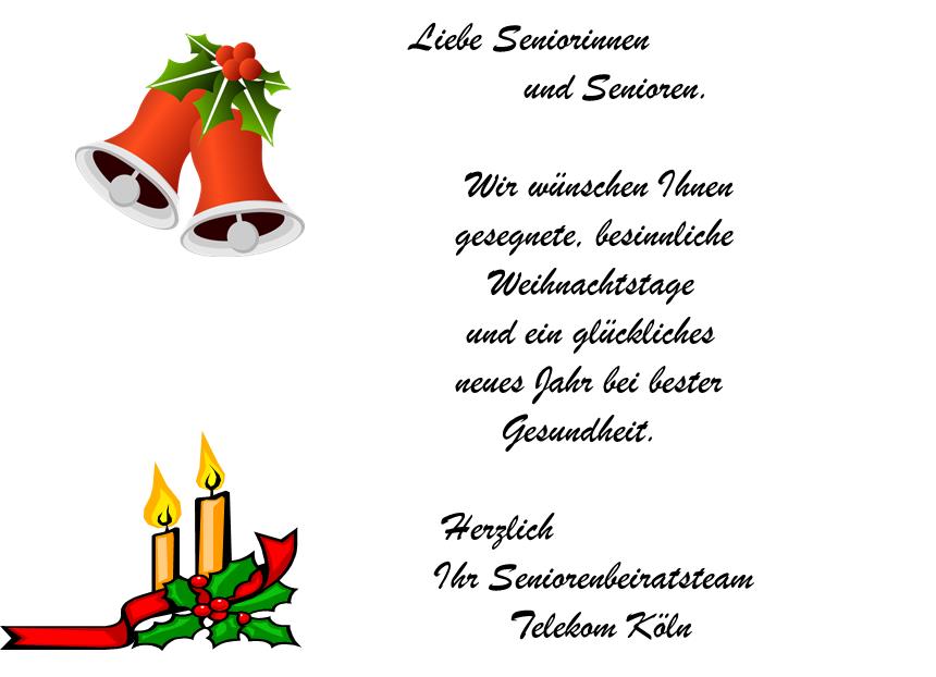 Wir wünschen Ihnen besinnliche und gesegnete Weihnachtstage und ein glückliches neues Jahr 2024 bei hoffentlich bester Gesundheit. Herzlichst Ihr Seniorenbeiratsteam GK Telekom Köln
