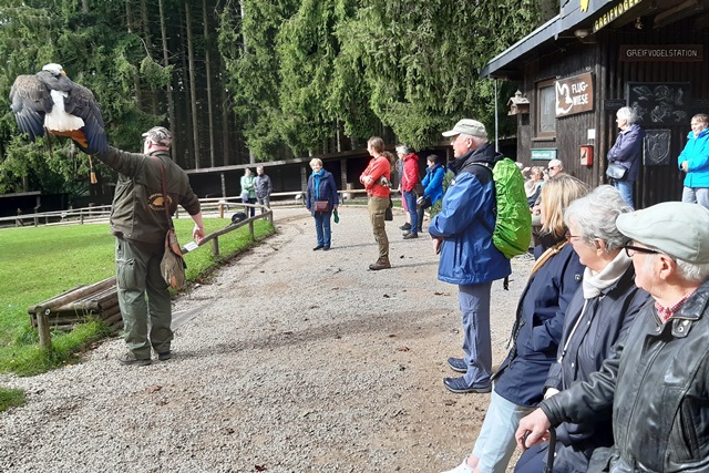 Am gewohnten Treffpunkt am Colonius in Köln fanden sich lediglich 23 Teilnehmer ein. Leider wieder ein Rückgang, obwohl diesmal einige Teilnehmer zum ersten Mal mitfuhren. Der Bus startete um 8:30 Uhr und traf nach ca. 90 Minuten auf dem Parkplatz vor dem Wildfreigehege ein. Schnell waren die Formalitäten an der Kasse erledigt und wir betraten das Gelände. Nach einem kurzen Spaziergang bis zur Flugwiese konnten wir die ersten Greifvögel bestaunen. Um 11 Uhr begann dann die Flugschau unter der kundigen Moderation eines Falkners. Uhus, Falken, Bussarde und Adler zeigten ihre Flugkünste. Wer wollte konnte sich anschließend mit einem Greifvogel fotografieren lassen.