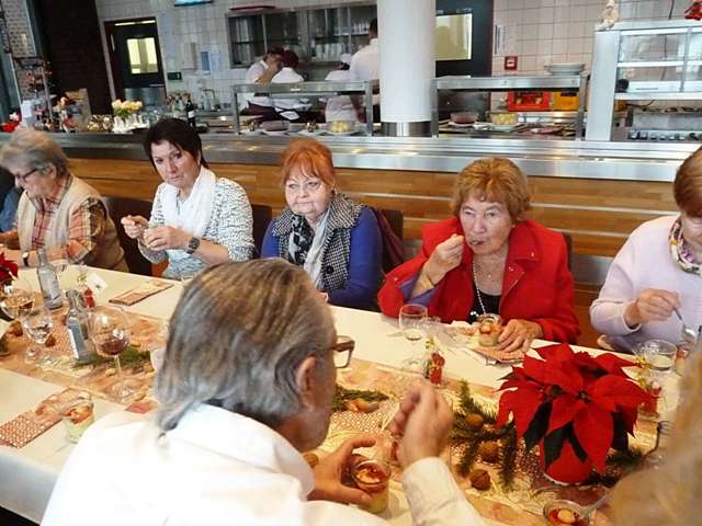 Der Saal war sehr schön weihnachtlich dekoriert und die Tische nett hergerichtet. Für jeden Teilnehmer lagen kleine Geschenke auf den Plätzen bereit. Nach der Begrüßung servierten die Bediensteten des Lokals das Essen. Ein Nachtisch durfte nicht fehlen. Nun wurde viel erzählt und die Zeit verging wie im Fluge.